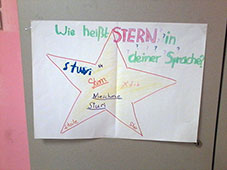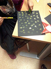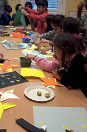 Lustig war es beim Origami mit Alice, Lisa und Ariane, die natürlich Sterne gefaltet haben, und dann gab es die Kinderbowle mit Wolf. Inzwischen hatte Ruth das mobile Planetarium aufgebaut. Zuerst haben wir uns den Himmel über uns angeschaut, dann sind wir mit einer Rakete zum Mond geflogen und noch weiter zum Saturn. Wir sind sogar zwischen seinen Ringen hindurchgezischt. Anschließend ging es wieder zurück auf unsere Erde. Wir waren pünktlich zu unserer Uhrzeit zu Hause.